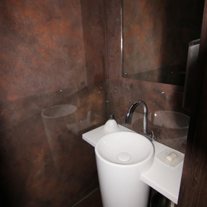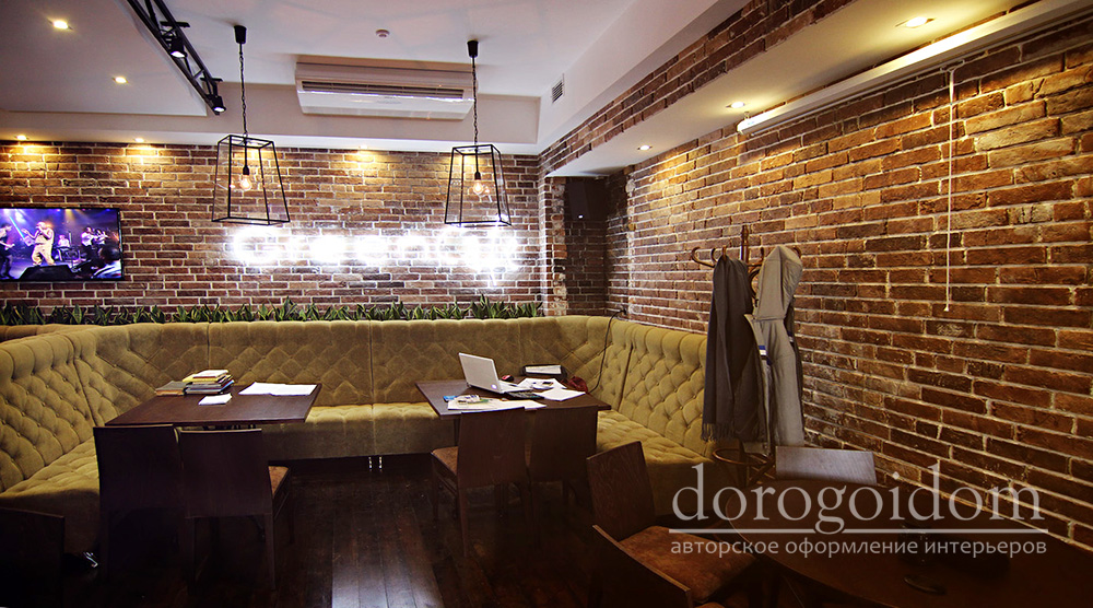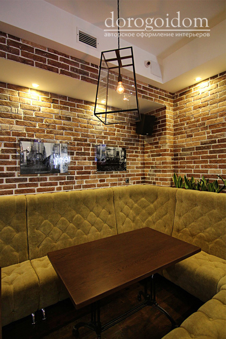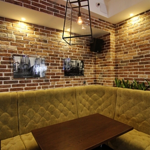 И нам действительно есть чем гордиться! Только взгляните на фотографии! Оформление стен выполнено авторскими фактурами "ржавчина" и "бетон", а сам кирпич был разработан индивидуально для этого проекта и декорирован нашими мастерами. Такая отделка гармонично сочетается с общим оформлением ресторана.