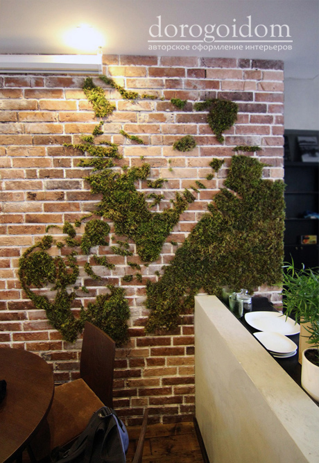 Специально для этого проекта был высажен натуральный мох в стиле Banksy. На окнах располагаются резные панели. Мебель разработана и изготовлена на заказ. Полиграфия, металлоконструкции, светильники и даже посуда – все это – дело наших рук.