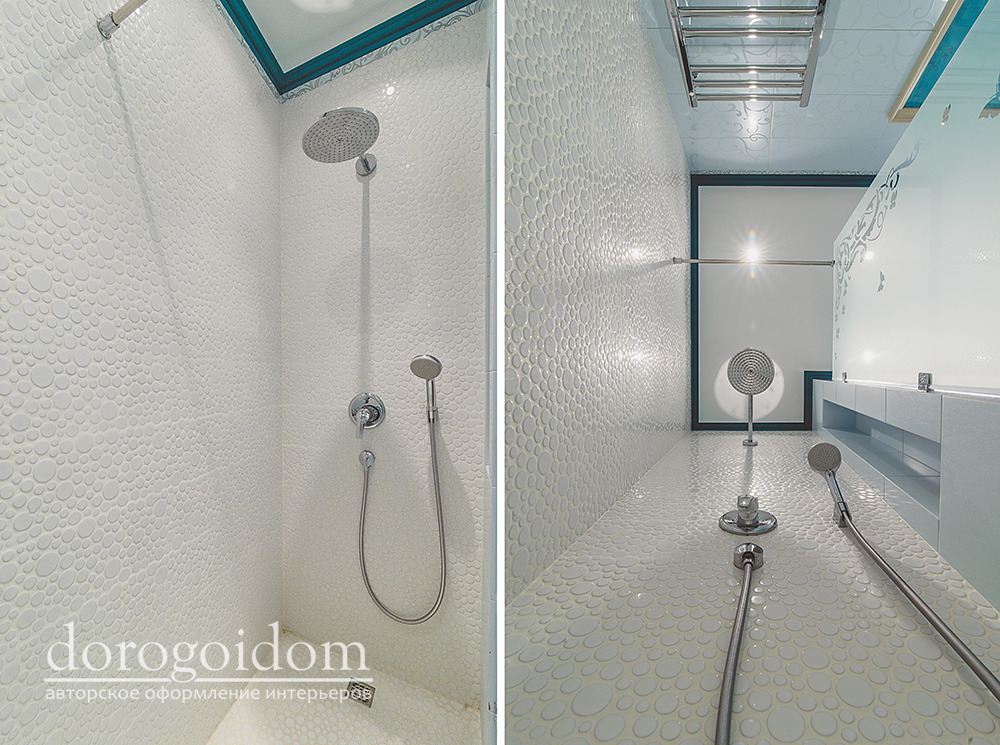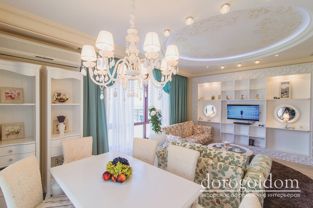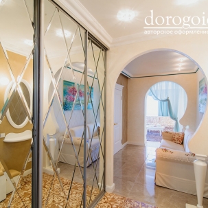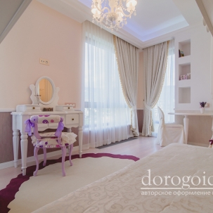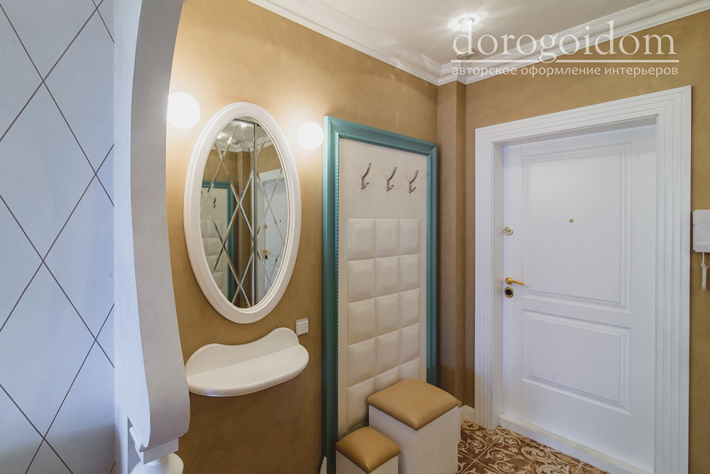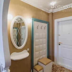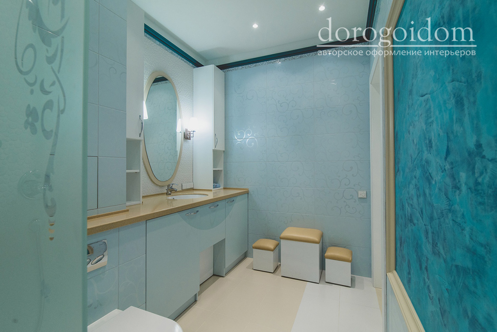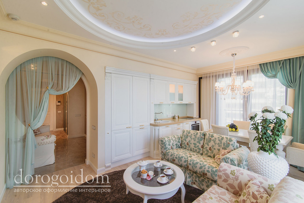 Интерьер выполнен в нежных бежевых, белых, бирюзовых и розовых оттенках. Отделка стен выполнена авторскими фактурами по идее дизайнеров студии Bellarte. А роспись потолков выполнена в технике лессировки. Много лепных изделий, так присущих классическому стилю.