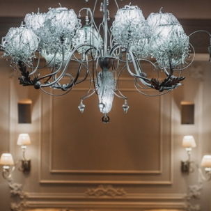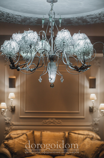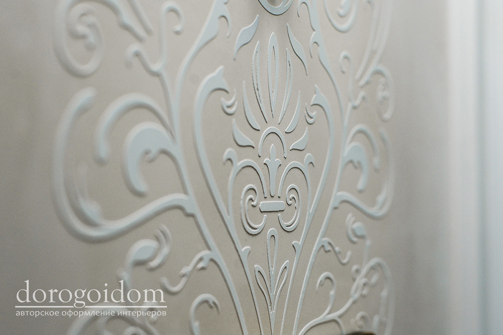 Отделка стен выполнена авторской декоративной штукатуркой, состоящей из декоративной штукатурки итальянского производителя премиум сегмента San Marco Grassello и прозрачной базы, с добавлением перламутровой пудры собственного производства.