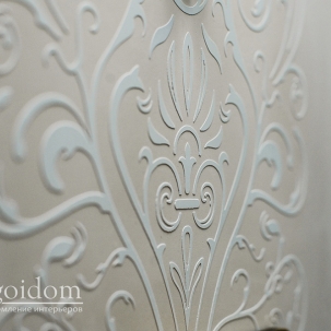 Все карты выделены разными оттенками одной цветовой гаммы. В спальнях выполнены трафареты белой San Marco Classic. Художественная роспись в гостиной выполнена с эффектом фрески по фактуре акрилом.