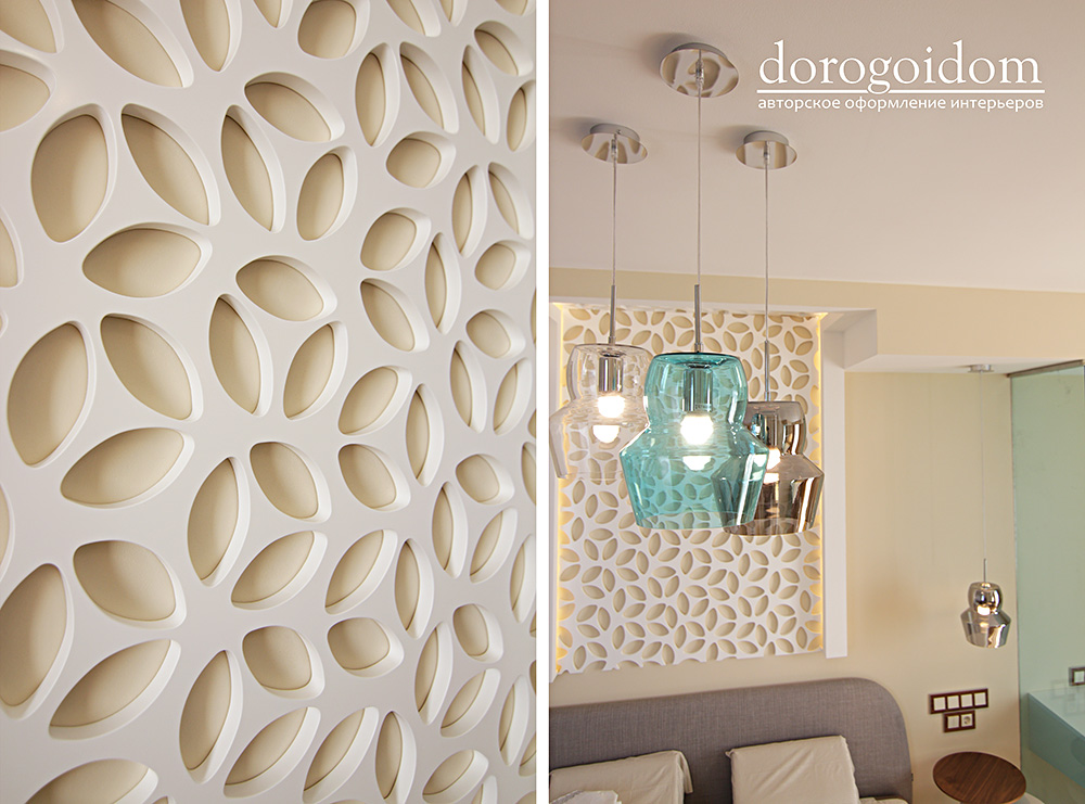 На кухне и в гостиной мы также использовали краску Baldini, а с помощью декоративной штукатурки «рогожка» мы оплотили идею создания теплой стены с текстурой льна.