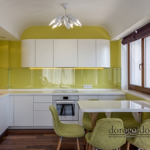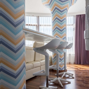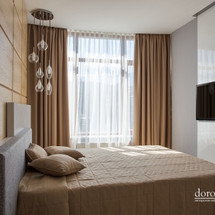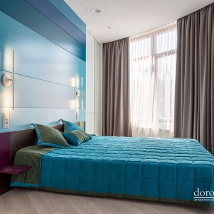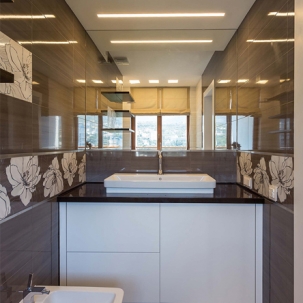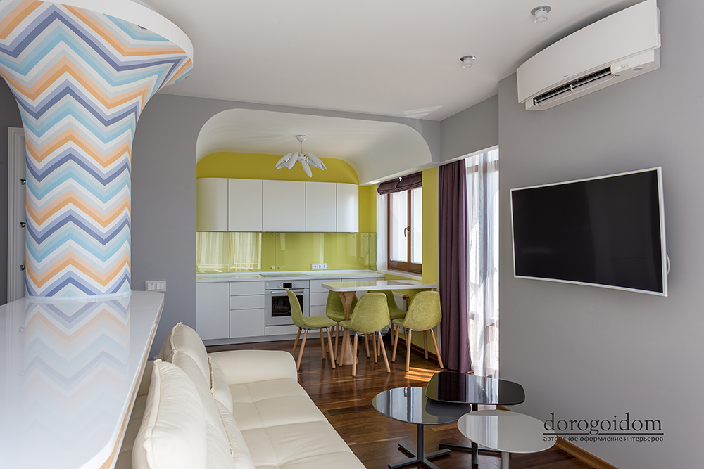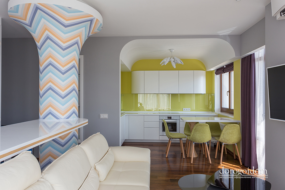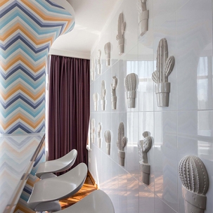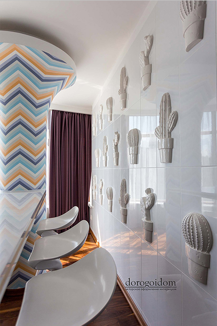 Над этим проектом команда арт - салона «Дорогой Дом» трудилась совместно с талантливыми, уже известными нам по другим роскошным проектам, дизайнерами дизайн-студии Bellarte. В гостиной мы выполнили роспись колонн, служивших основами барной стойки – сложная геометрия и очень кропотливая работа наших мастеров. Получилось очень впечатляюще! Еще одна изюминка – белая стена из кактусов, они выполнены на заказ из Италии. В одной из спален, дл я зоны под телевизор, мы использовали 3D панели, напоминающие нам соты.