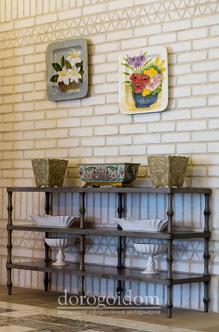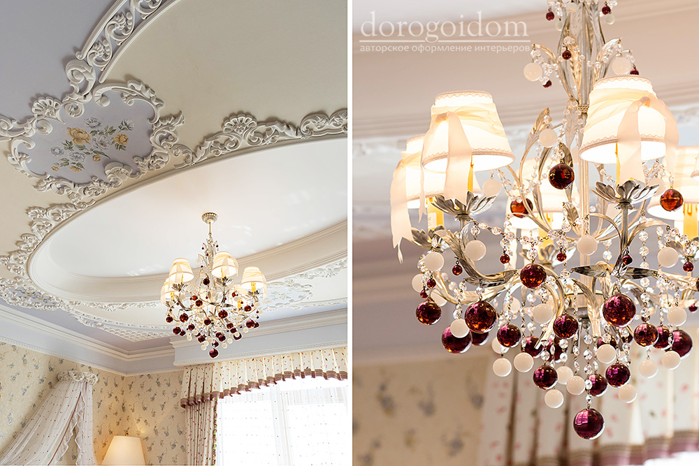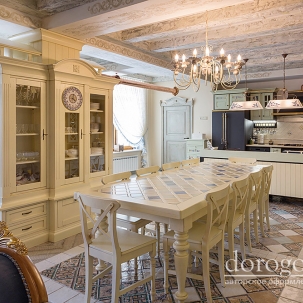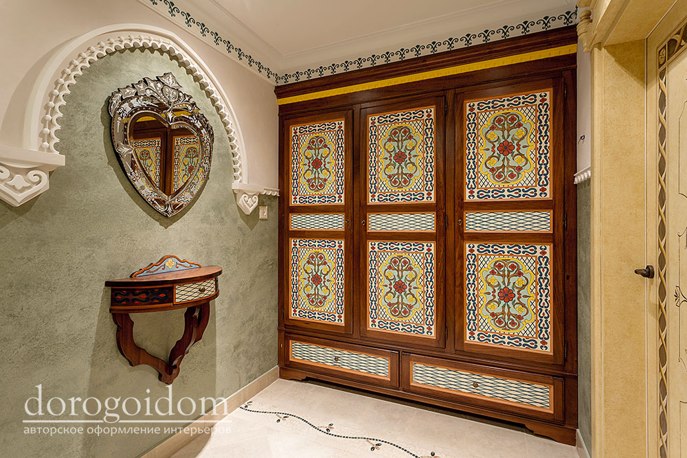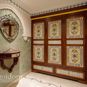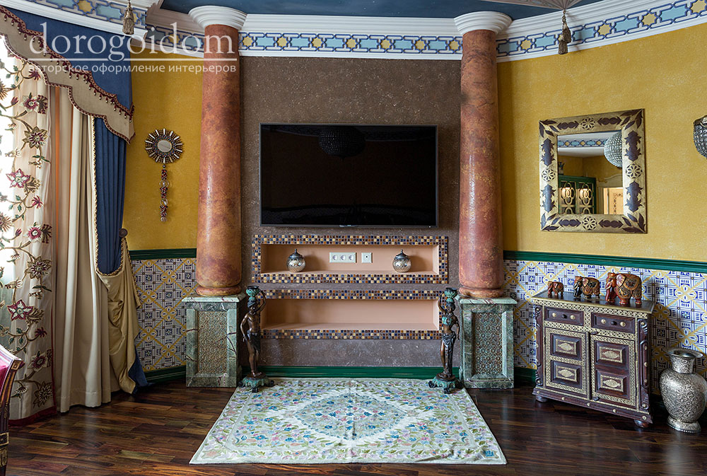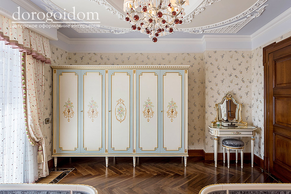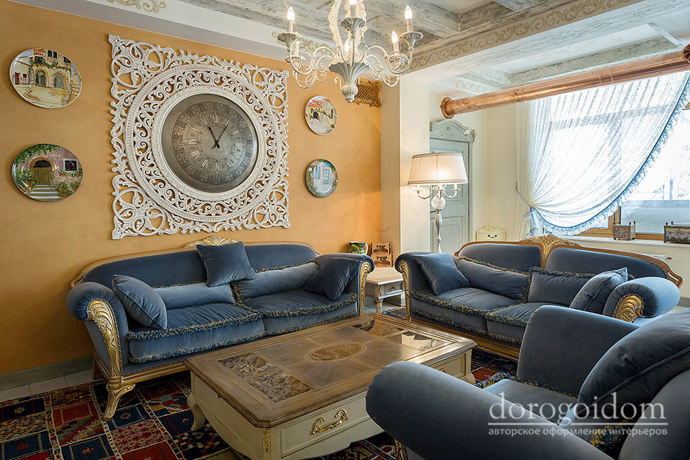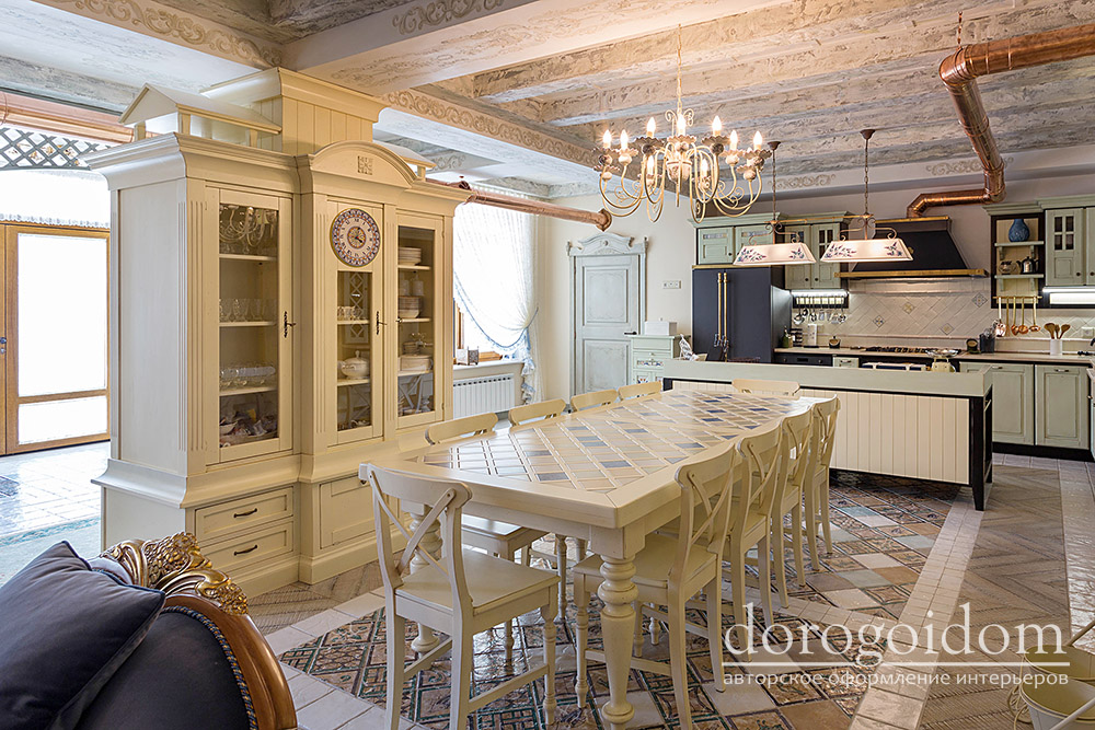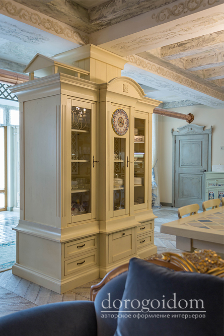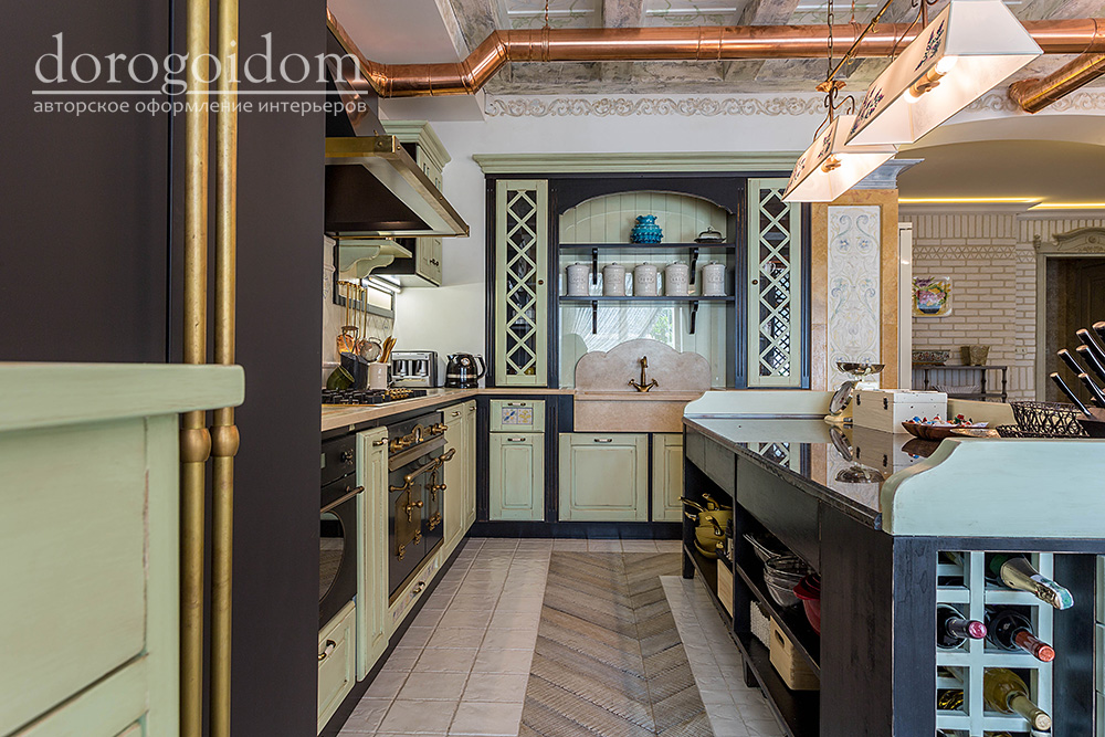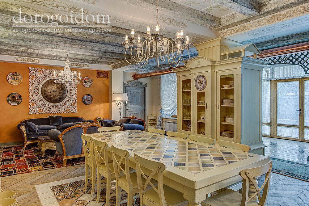 В этом авторском проекте удачно сочетаются различные стили: классика, ренессанс, прованс, среднеземноморский и даже марокканский стиль. Мебель из Италии, выполненная по индивидуальным эскизам, натуральные ткани, лепной декор, художественная роспись - все подчеркивает неповторимость данного проекта. Здесь каждый найдет себе пространство для души, в доме нет ни одной гостевой спальни, каждая комната сделана для конкретного члена семьи с учётом его интерьерных предпочтений и привычек. Заказчики лично