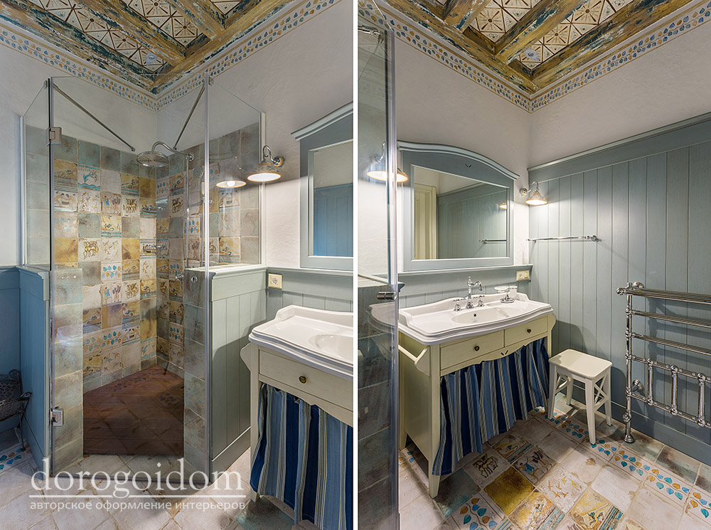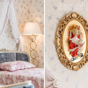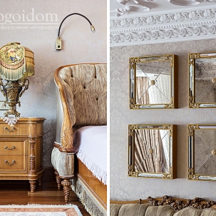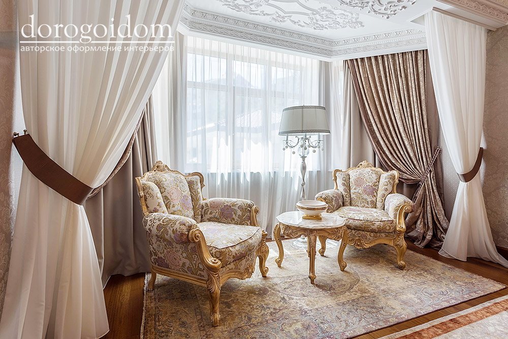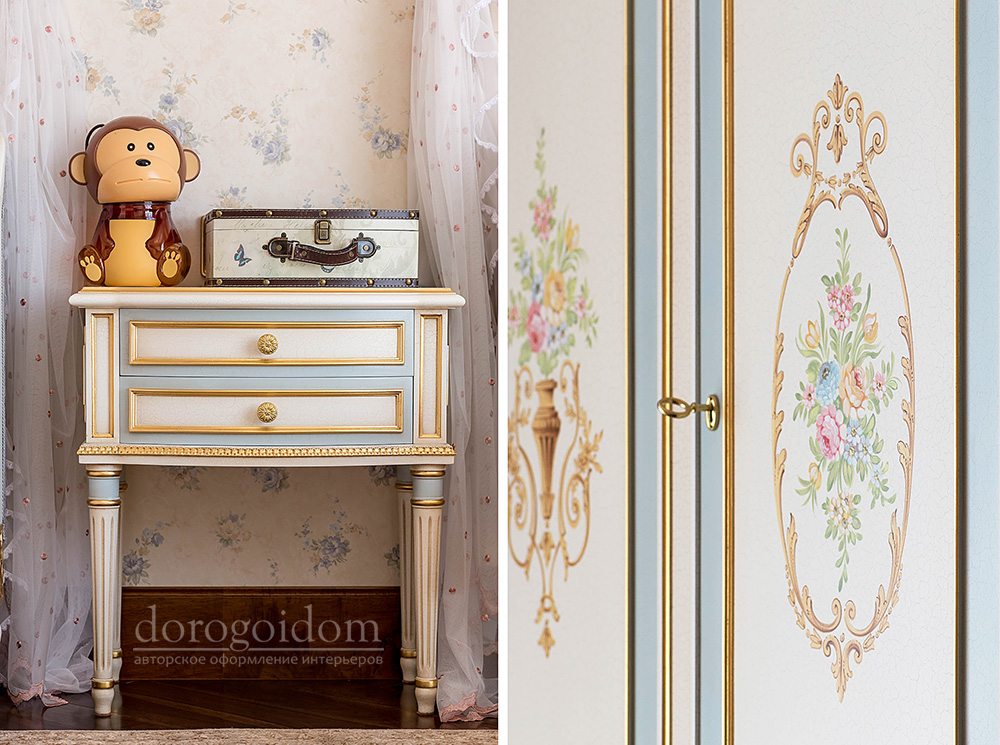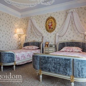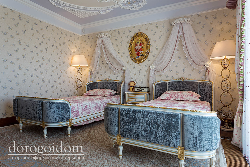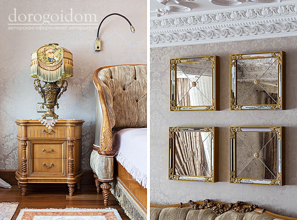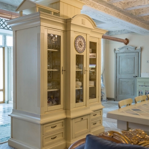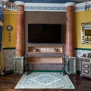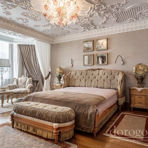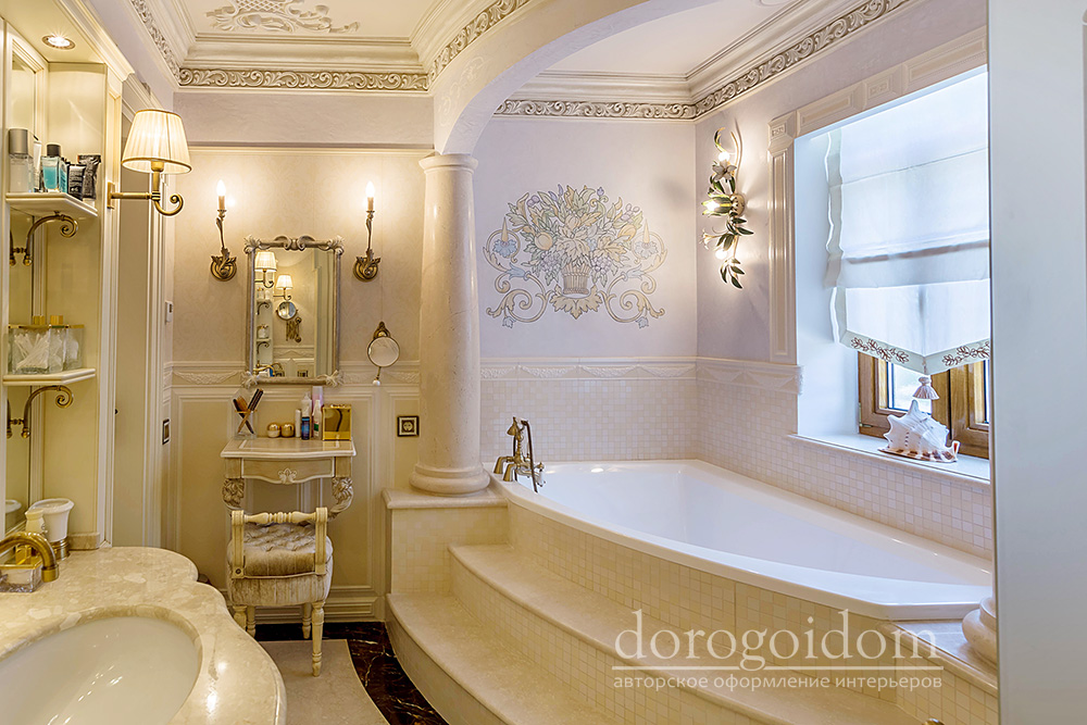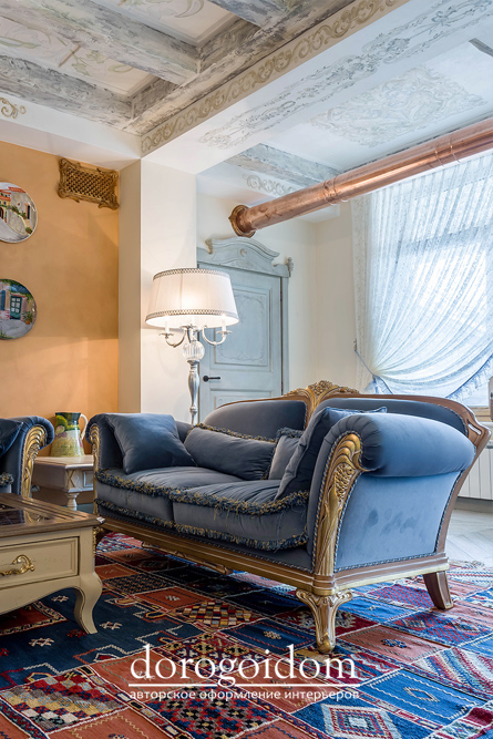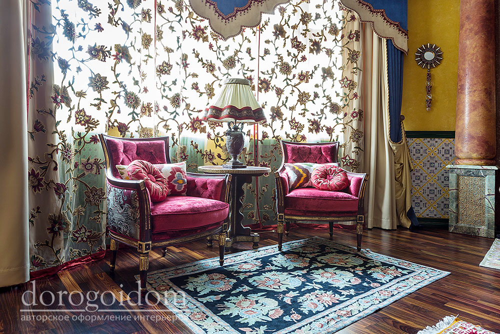 В этом авторском проекте удачно сочетаются различные стили: классика, ренессанс, прованс, среднеземноморский и даже марокканский стиль. Мебель из Италии, выполненная по индивидуальным эскизам, натуральные ткани, лепной декор, художественная роспись - все подчеркивает неповторимость данного проекта. Здесь каждый найдет себе пространство для души, в доме нет ни одной гостевой спальни, каждая комната сделана для конкретного члена семьи с учётом его интерьерных предпочтений и привычек. Заказчики лично