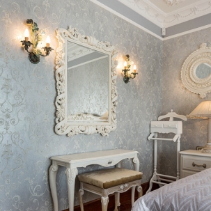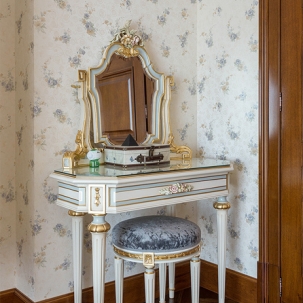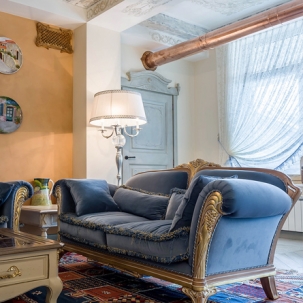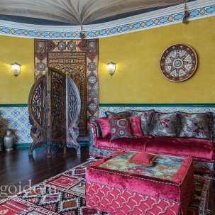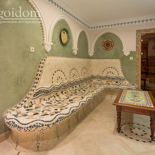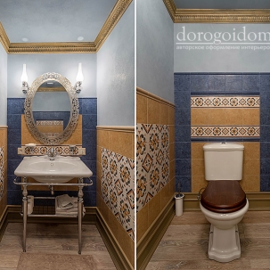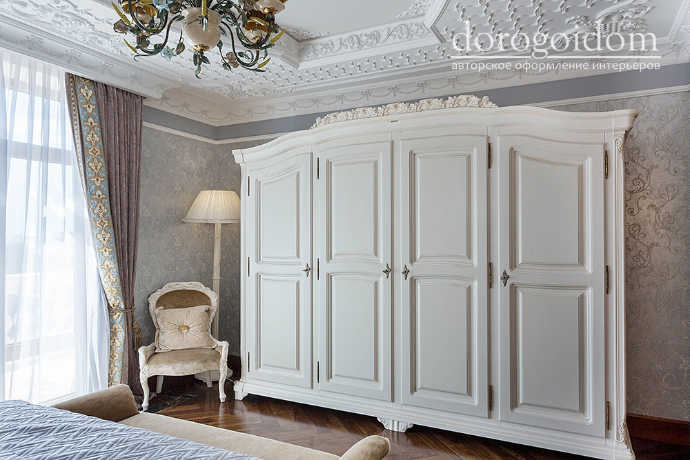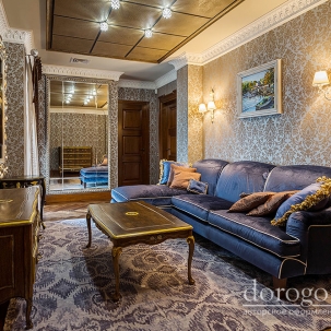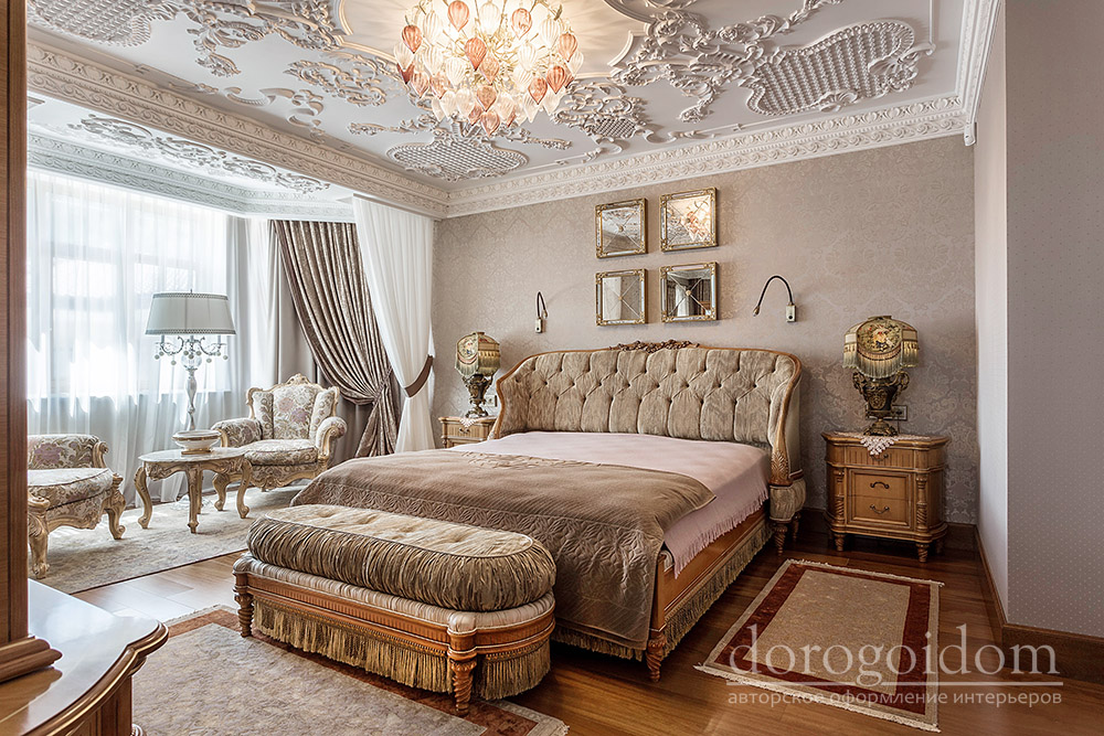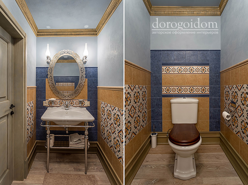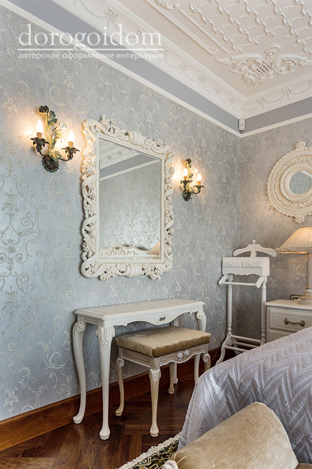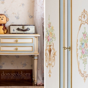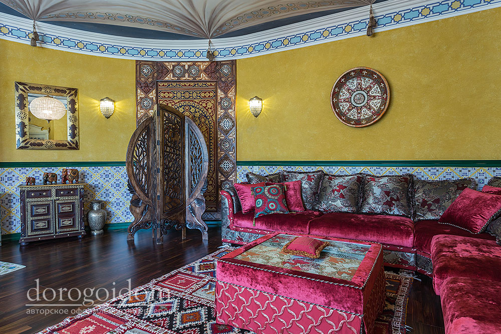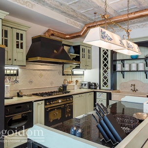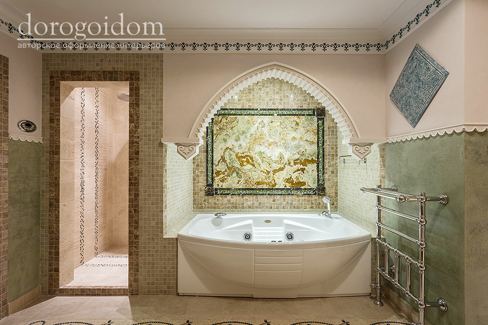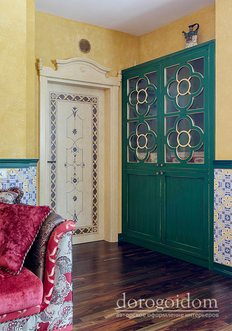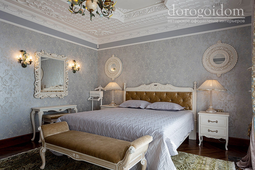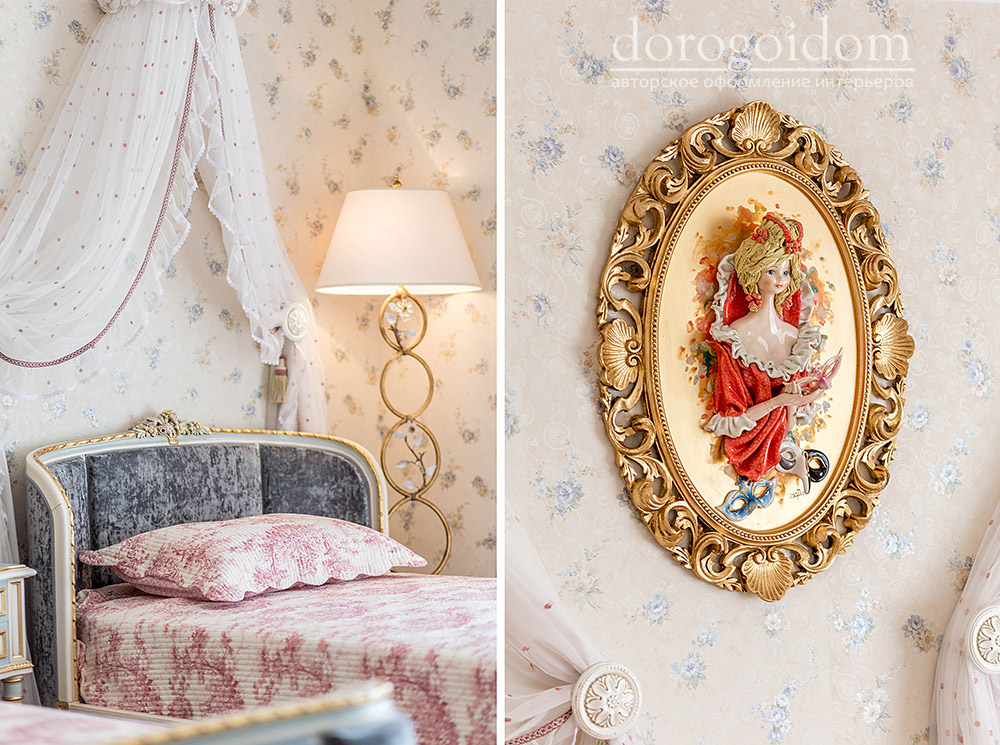 В этом авторском проекте удачно сочетаются различные стили: классика, ренессанс, прованс, среднеземноморский и даже марокканский стиль. Мебель из Италии, выполненная по индивидуальным эскизам, натуральные ткани, лепной декор, художественная роспись - все подчеркивает неповторимость данного проекта. Здесь каждый найдет себе пространство для души, в доме нет ни одной гостевой спальни, каждая комната сделана для конкретного члена семьи с учётом его интерьерных предпочтений и привычек. Заказчики лично